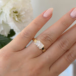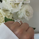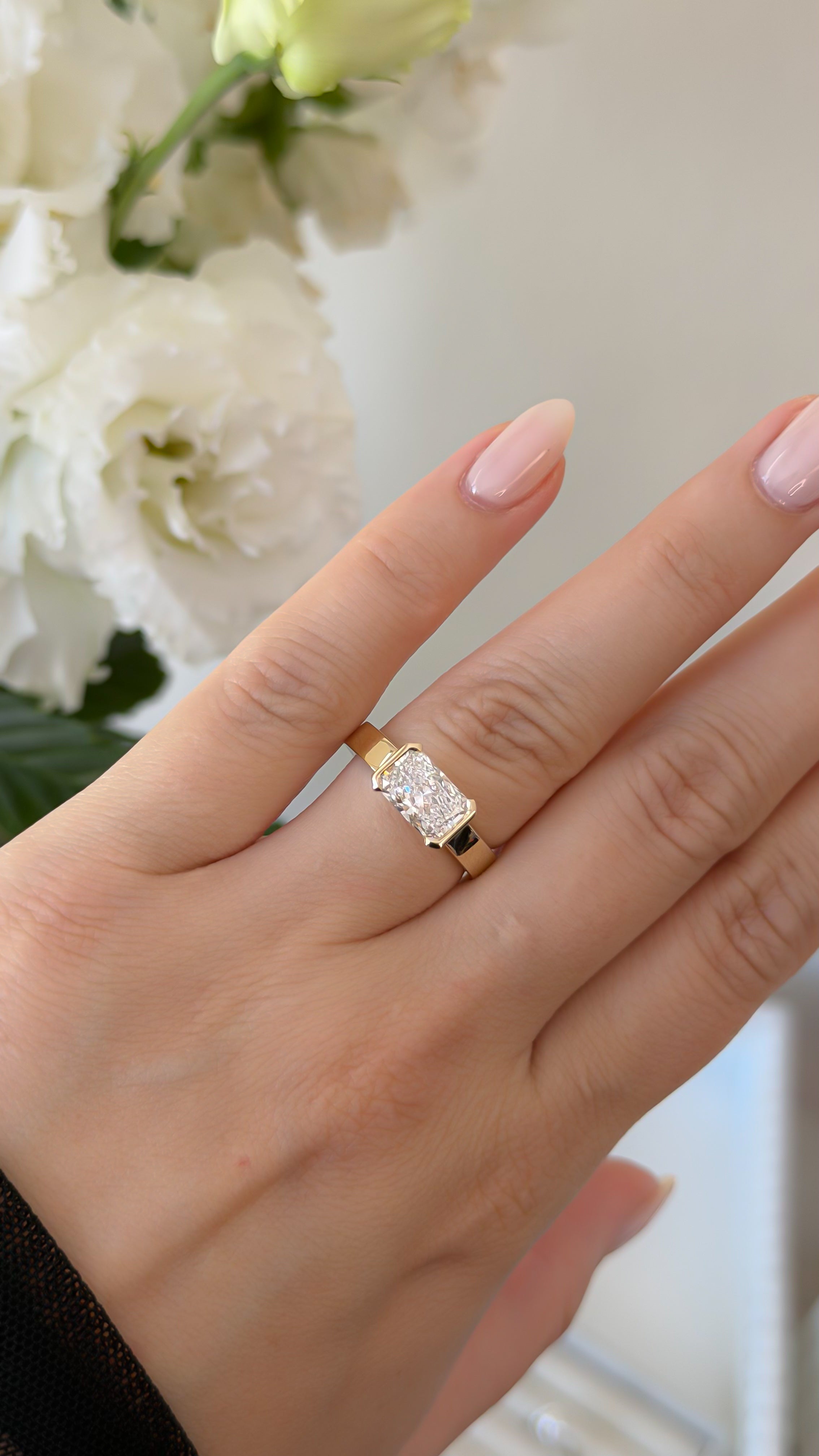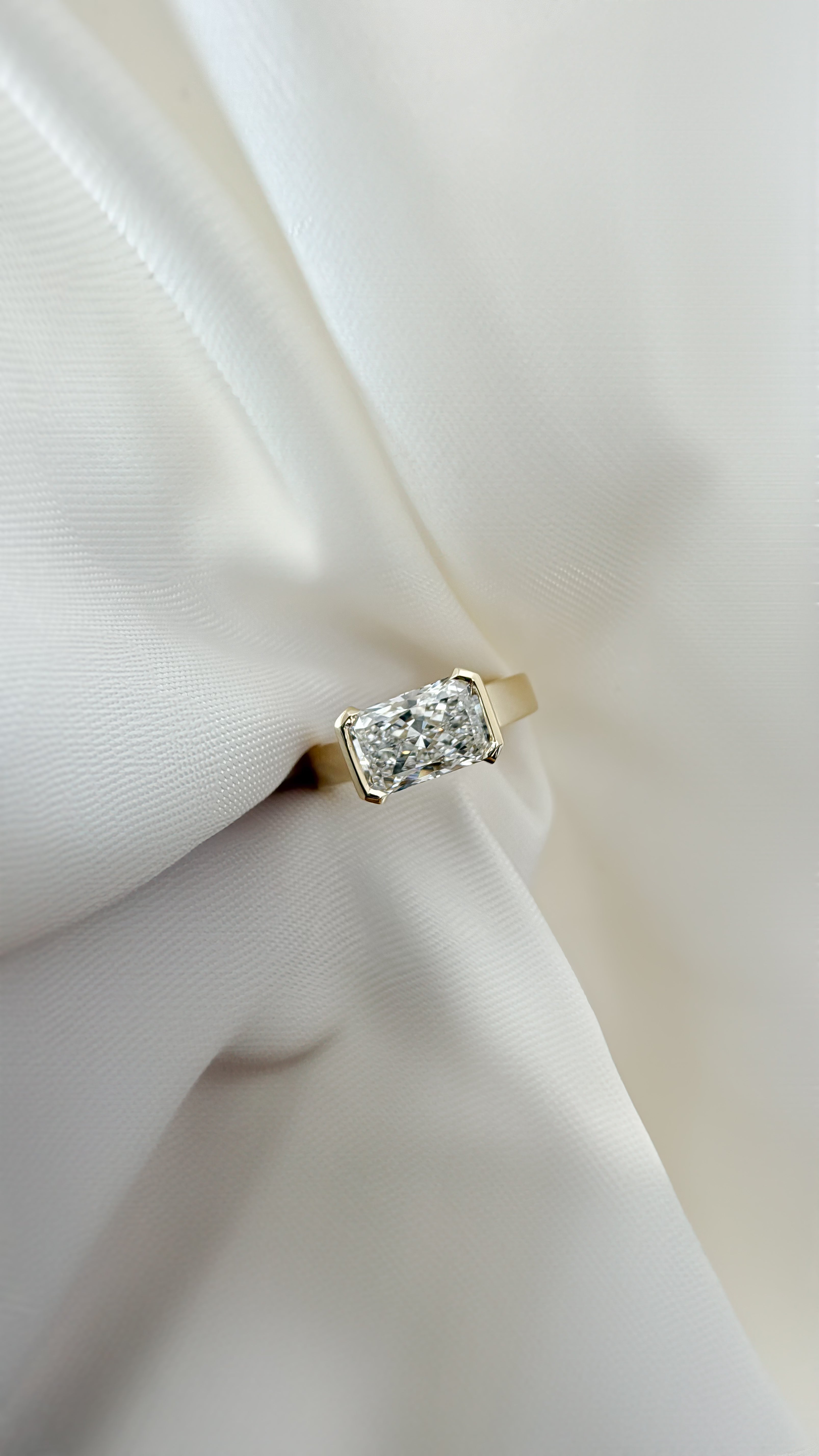 Featuring an east–west set radiant cut diamond, the design highlights the stone’s brilliance while creating a striking horizontal silhouette on the finger.