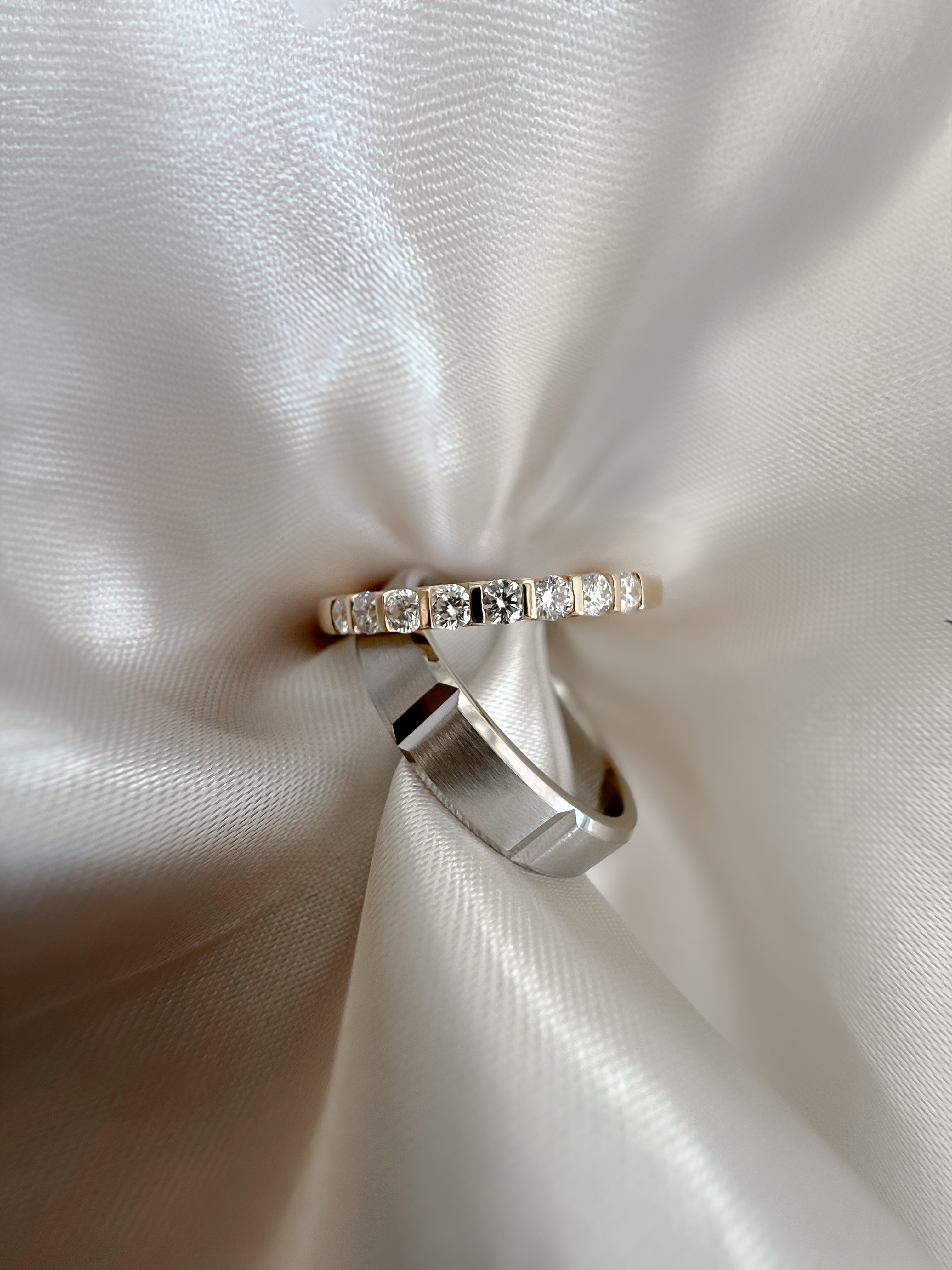 The Alan Wedding Band brings modern masculinity to timeless form. Featuring a satin-brushed finish and distinct groove detailing, this design strikes the perfect balance between strength and sophistication.